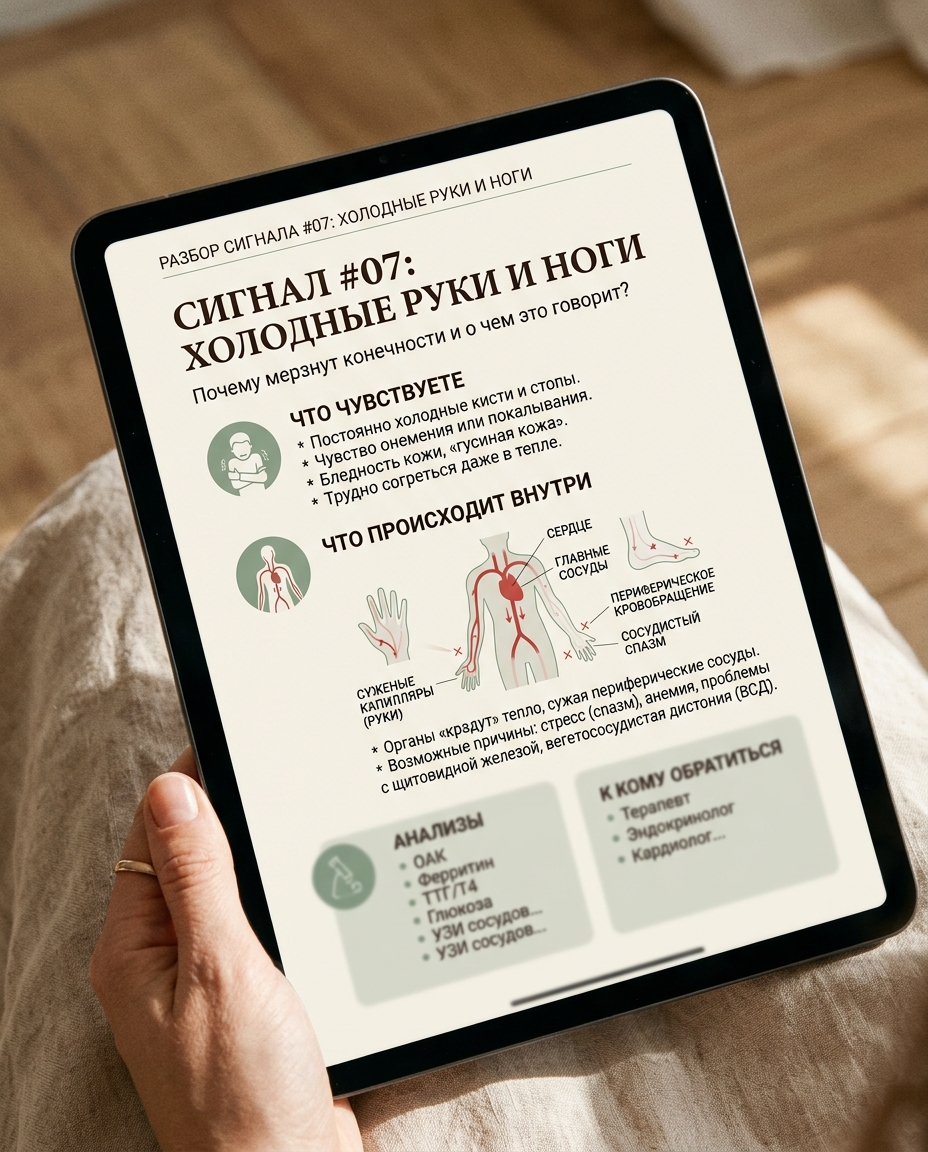 Что происходит внутри: Периферическое кровообращение снижено. Три основные причины: сниженная функция щитовидной железы, низкий ферритин, хронический спазм сосудов на фоне...