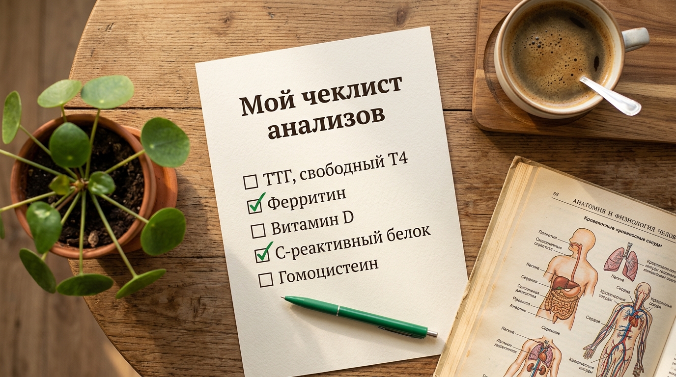 Анализы: ТТГ, свободный Т4, ферритин, гомоцистеин, витамин B12...