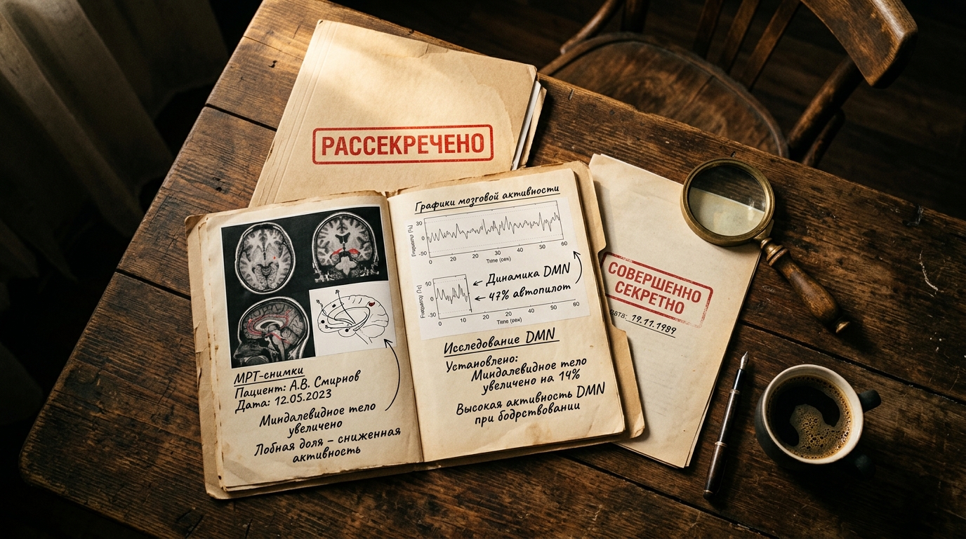 DMN не выключается во сне. Мозг застревает в поверхностных фазах. Не проходит глубокие восстановительные циклы. Кофе утром, раздражительность к вечеру, и так по кругу. Годами.