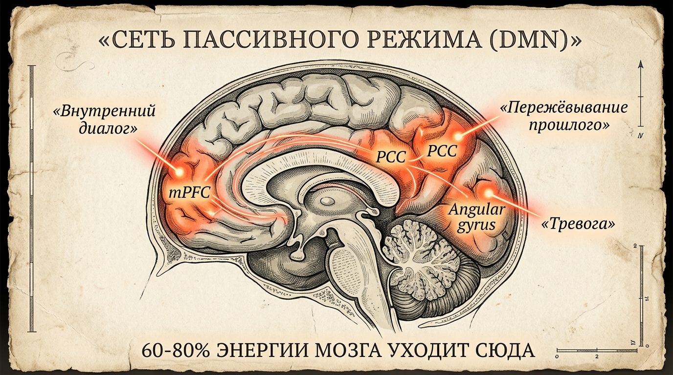 Default Mode Network. Сеть пассивного режима. Открыта в 2001 году Маркусом Райхлом. Она включается, когда вы «ничего не делаете». Генерирует внутренний диалог, пережёвывание прошлого, тревогу о будущем, фантазии и сценарии.