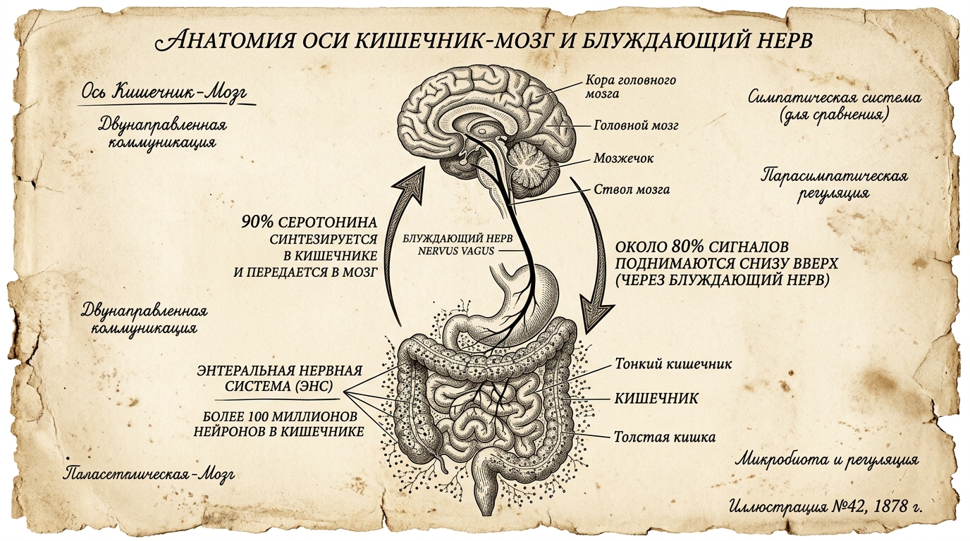 Когда DMN перегружена, запускается каскад: стресс → кортизол → замедление пищеварения → изменение микрофлоры → падение серотонина → тревога и подавленность.